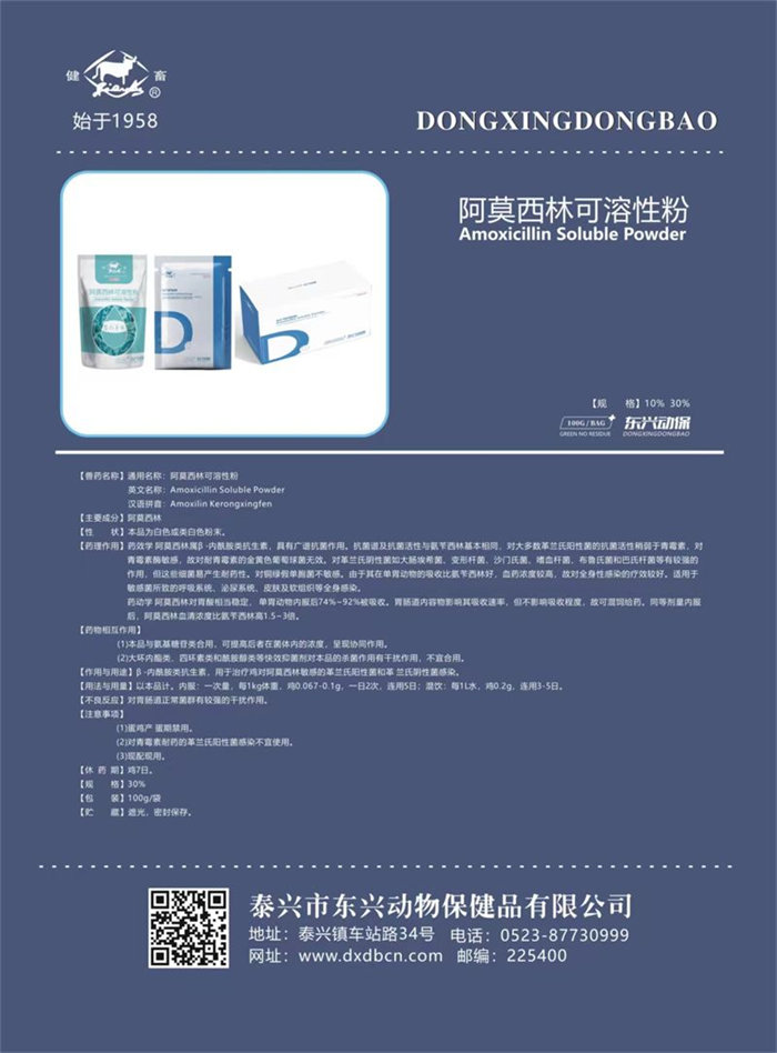 【作用與用途】β-內(nèi)酰胺類抗生素,用于治療雞對阿莫西林敏感的革蘭氏陽性菌和革蘭氏陰性菌感染。